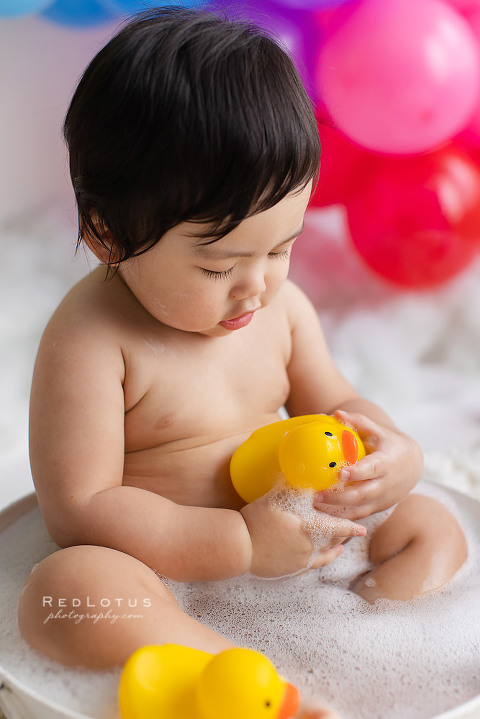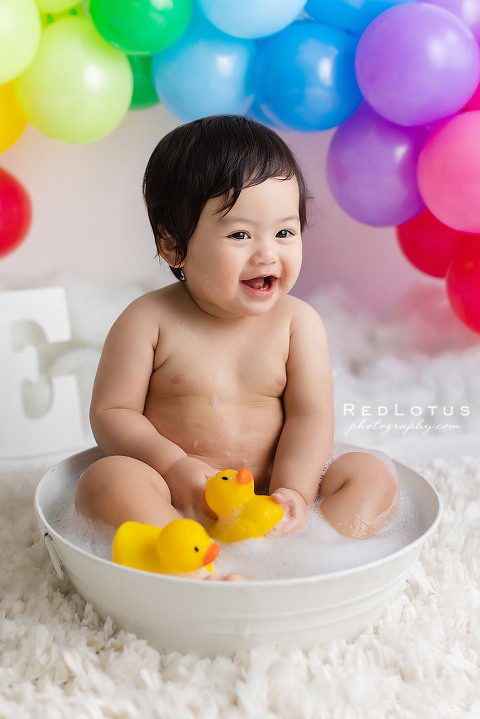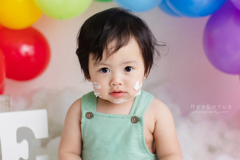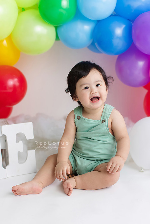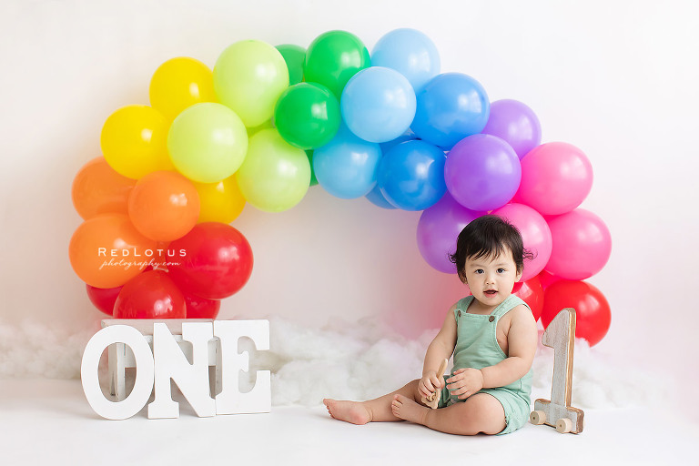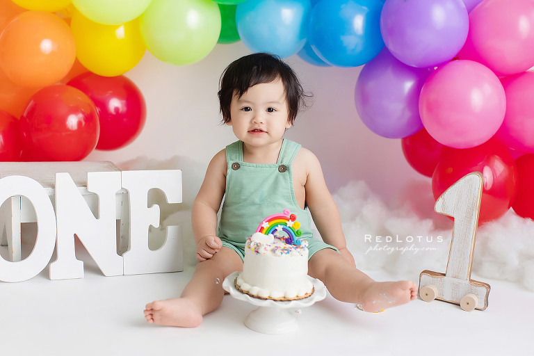 Meet Mr. Adorable! Mom chose a vibrant rainbow themed cake smash for him to match the Cocomelon birthday party she had planned for him. She displayed several prints from his cake smash session all through the party room, even on the cake. It looked so amazing and personalized!