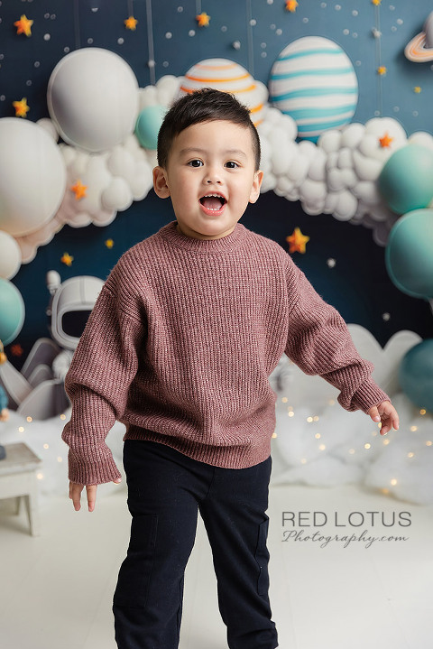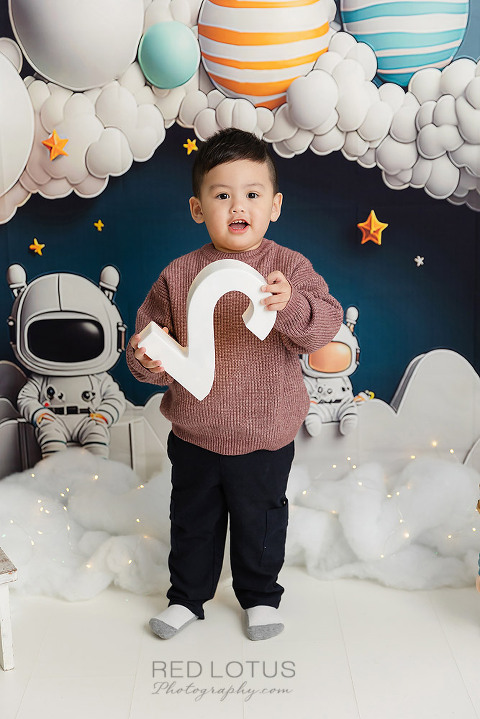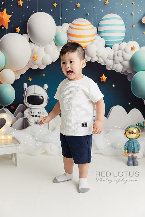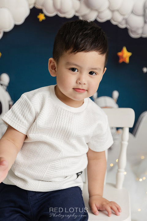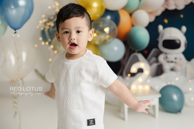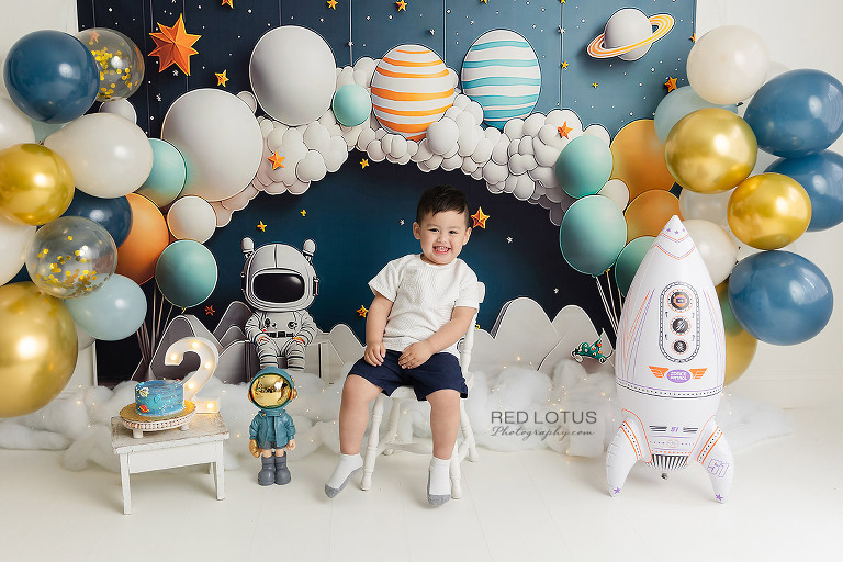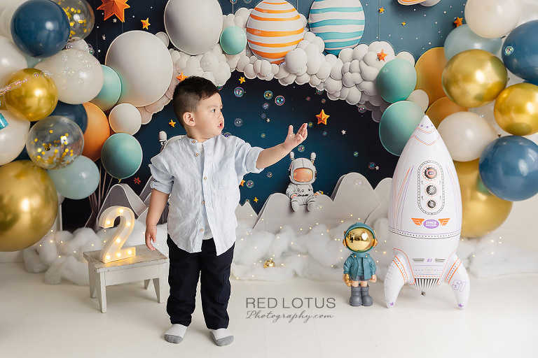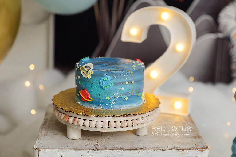 Happy Birthday, Little Man!  Your second trip around the sun was out of this world!  Let’s celebrate your second birthday with a space-themed cake smash session, complete with outer space backdrop, rocket, space-themed cake with little icing planets (so cute!), and a fun astronaut buddy to help you explore the universe.