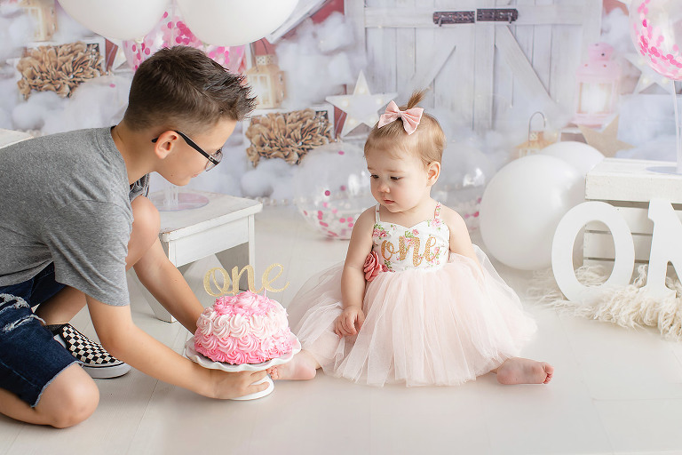 Big brother is here to help you celebrate. Look at that pink, fluffy cake!